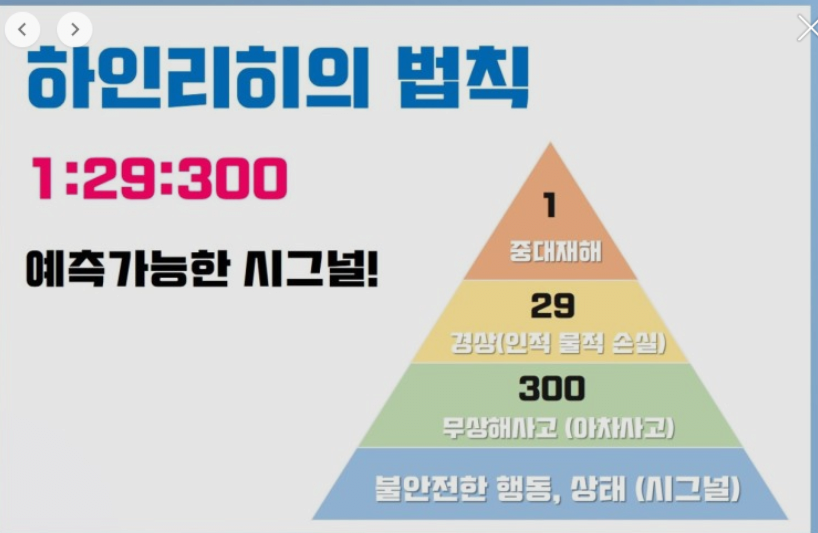 즉, 큰 재해와 작은 재해 그리고 사소한 사고의 발생 비율은 1:29:300이라는 것이다. 단, 여기서 중요한 것은 숫자 자체가 아닌 산업재해와 그 징후의 비율이다. 이는 대부분의 참사가 사전에 예방할 수 있는 원인을 파악, 수정하지 못했거나 무시했기 때문에 일어났다는 것을 보여준다.